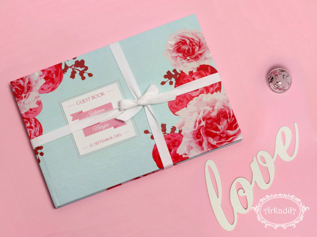 • Sveska 50 strana, tvrdi povez sa ukrasnim koricama i imenima mladenaca