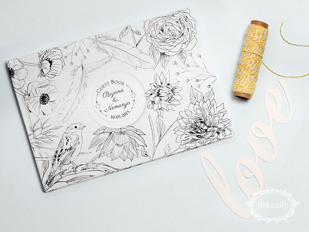 • Sveska 50 strana, tvrdi povez sa ukrasnim koricama i imenima mladenaca