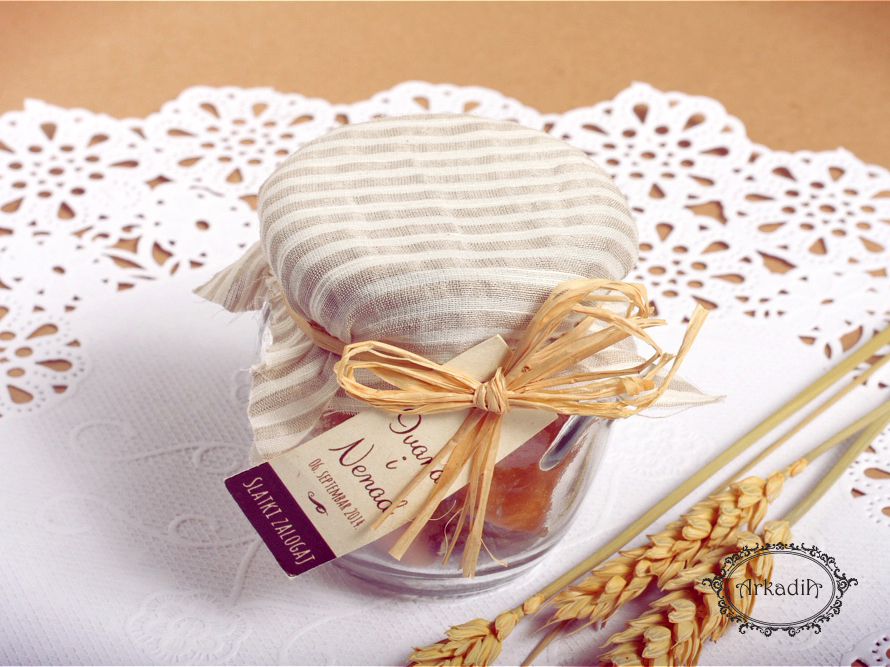 • karamel bombone u teglici sa platnom preko poklopca, trakom i sa porukicom štampanom po želji
