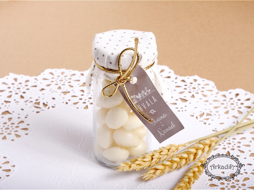 • bombone u teglici sa platnom preko poklopca, trakom i sa porukicom štampanom po želji